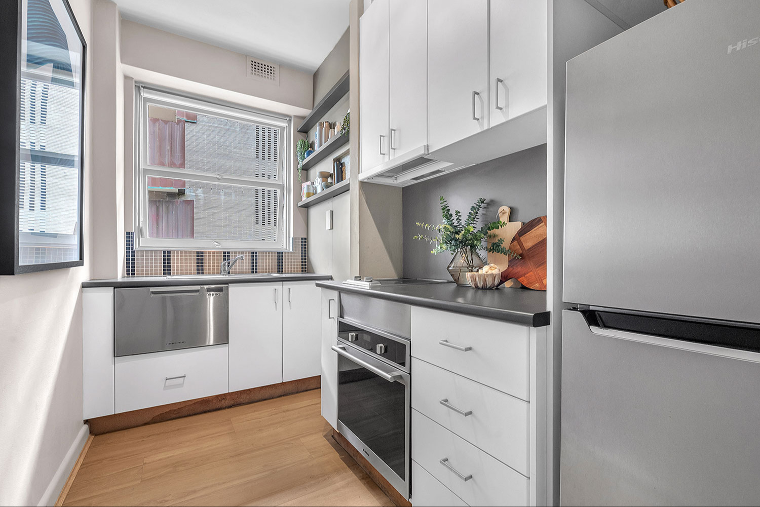 From the North-facing balcony of this tastefully renovated apartment enjoy views to the harbour to the East and city to the West.